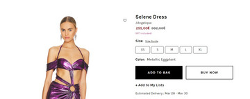 Το φόρεμα της Μαριέττας δεν είναι διαθέσιμο σε χρυσό αλλά καταφέραμε να το βρούμε σε μωβ χρώμα. Το κόστος του φορέματος ανέρχεται στα 382 ευρώ, ωστόσο αυτή τη στιγμή βρίσκεται σε έκπτωση και η τιμή έχει πέσει στα 255 ευρώ.