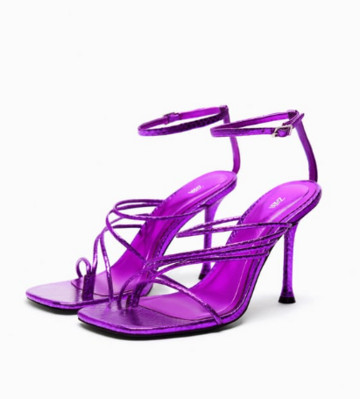 Τα strappy ψηλοτάκουνα πέδιλα σε metallic μωβ χρώμα είναι μια εξαιρετική επιλογή για τα wedding guest looks σου. Κοστίζουν 39.99€ και μπορούν να συνδυαστούν με slip dress ή με το little black dress σου.