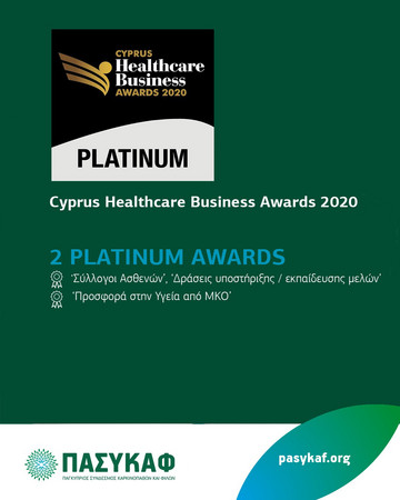 2 Platinum Awards απονεμήθηκαν στα Cyprus Healthcare Business Awards στον Παγκύπριο Σύνδεσμο Καρκινοπαθών και Φίλων ΠΑΣΥΚΑΦ, για τη δράση του ως Σύλλογος Ασθενών και για την Προσφορά του στην Υγεία ως Μη Κερδοσκοπικός Οργανισμός.