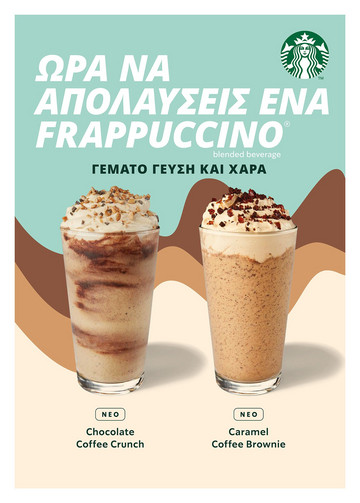 Caramel Coffee Brownie Frappuccino®: Κομμάτια από Brownie με καραμέλα αναμιγνύονται με γάλα και πάγο με μια ξεχωριστή σαντιγί από καφέ και ένα υπέροχο γαρνίρισμα caramel brulée και θρυμματισμένο brownie. Από την πρώτη γουλιά, θα το λατρέψετε και θα γίνει η αγαπημένη συνήθεια του καλοκαιριού.