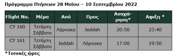 Η Cyprus Airways, ανακοινώνει την έναρξη των πτήσεων της προς Jeddah από τις 28 Μαΐου, 2022, με 2 εβδομαδιαίες πτήσεις, κάθε Τετάρτη και Σάββατο.