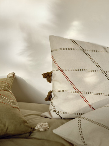 Για ακόμα πιο αρμονικό αποτέλεσμα, δημιουργήστε ενδιαφέρουσες χρωματικές αντιθέσεις στους χώρους, επιλέγοντας το κάλυμμα μαξιλαριών HILDAMARIA. Τα έντονα χρώματα και τα γεωμετρικά σχήματά του ισορροπούν ανάμεσα στο μοντέρνο στιλ και τον παραδοσιακό τρόπο έκφρασης. Είναι διαθέσιμο σε πράσινο/φυσικό χρώμα και αποτελεί μία φιλική προς το περιβάλλον επιλογή για το σπίτι σας, καθώς το βαμβάκι από το οποίο δημιουργείται προέρχεται από βιώσιμες πηγές. Μπορείτε να το ταιριάξετε με τα χειροποίητα καλύμματα μαξιλαριών HERVOR και HALLVI, τα οποία διαθέτουν ένα ιδιαίτερο κέντημα από τη μία πλευρά ενώ είναι απλά από την άλλη, για να επιλέξετε όποια πλευρά σας αρέσει περισσότερο. Αυτά τα χειροποίητα καλύμματα μαξιλαριών φτιάχνονται από την κοινωνική επιχείρηση Rangsutra στην Ινδία, έτσι ώστε να παρέχουν μακροπρόθεσμα στις γυναίκες που τα υφαίνουν, τα προς το ζην και να σας προσφέρουν κάτι μοναδικό, για να διακοσμήσετε το σπίτι σας.