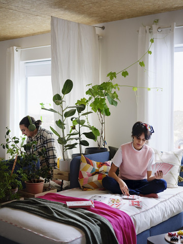 Αν και παραδοσιακά στο σαλόνι γίνεται η μεγαλύτερη δράση, τα δύο αδέλφια χώρισαν τον προσωπικό τους χώρο κι έτσι η αδελφή χρησιμοποιεί περισσότερο το υπνοδωμάτιο και ως χώρο για να δεχτεί μια φίλη, να παίξουν χαρτιά ή απλώς να πούνε τα δικά τους πάνω στο άνετο διπλό κρεβάτι ή σε έναν μικρό και βολικό διθέσιο καναπέ όπως ο KLIPPAN. Την ίδια στιγμή, ο αδελφός, που αγαπάει πολύ την κηπουρική, βρίσκει καταφύγιο στον κήπο φυτεύοντας, ποτίζοντας κασπό και γλάστρες ή ακόμα και μιλώντας με τα φυτά του, δημιουργώντας παράλληλα μια μικρή όαση στην πόλη.