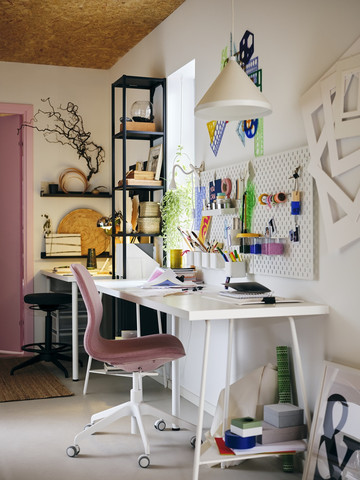 Και το θέμα της εργασίας από το σπίτι τακτοποιήθηκε όταν τοποθέτησαν στον διάδρομο δύο τραπέζια εργασίας με τα αντίστοιχα έπιπλα αποθήκευσης, όπως ο ψηλός σκελετός με ράφια, ο διάτρητος πίνακας με αξεσουάρ SKADIS αλλά και ράφια για κορνίζες.Και για καρέκλα γραφείου ο καθένας διάλεξε αυτή που τον βολεύει.