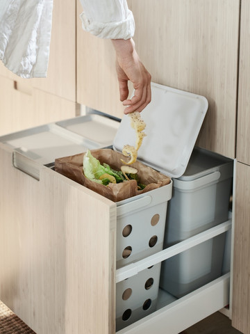 Για να βρεθείτε ένα βήμα πιο κοντά στη δημιουργία μίας βιώσιμης κουζίνας, η διαδικασία είναι απλή. Μπορείτε να αποθηκεύσετε τα λαχανικά σας στη διχτυωτή τσάντα KUNGSFORS ή να τα πλύνετε σε μπολ πλυσίματος GRUNDVATTNET που θα κάνει πιο εύκολη την προετοιμασία τους. Προτιμήστε τους κάδους HÅLLBAR για οργανικά απορρίμματα κάτω από τον νεροχύτη, που θα σας βοηθήσουν να ξεχωρίζετε διαφορετικά υλικά σε διαφορετικούς κάδους – μια απλή πράξη που θα δώσει νέα ζωή στα απορρίμματα. Σε επίπεδο σχεδιασμού της κουζίνας σας, διαλέξτε τις προσόψεις συρταριού FRÖJERED από μπαμπού – ένα ταχέως αναπτυσσόμενο και βιώσιμο υλικό που είναι ανθεκτικό και έχει όμορφη εμφάνιση.