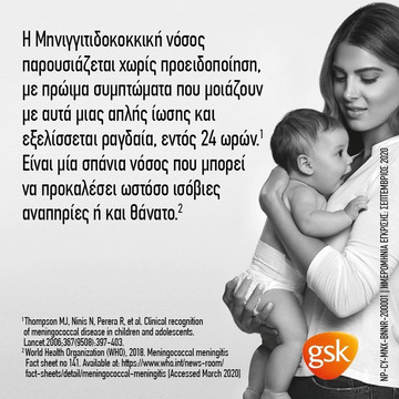 Η GSK θα υλοποιήσει σειρά ενημερωτικών δράσεων με στόχο τη συστηματική ενημέρωση των γονέων για τα συμπτώματα, τις επιπτώσεις και την πρόληψη της Mηνιγγιτιδοκοκκικής Μηνιγγίτιδας. Στόχος της GSK είναι η ολοκληρωμένη και υπεύθυνη ενημέρωση των γονέων, οι οποίοι, σε κάθε περίπτωση πρέπει να συμβουλεύονται πρώτα τον παιδίατρό τους.