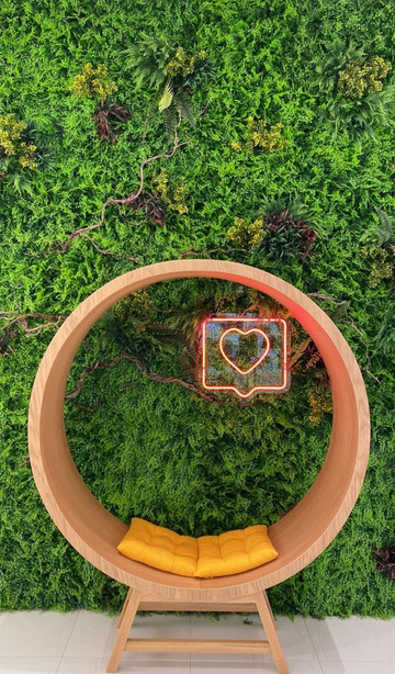 Περπατώντας στο κατάστημα δεν μπορείς παρά να παρατηρήσεις τον τεράστιο artificial πράσινο τοίχο που γεμίζει όλο το ύψος του χώρου. Κάθισε στο ξύλινο παγκάκι και ο πράσινος τοίχος θα γίνει το τέλειο σημείο για μια Selfie!