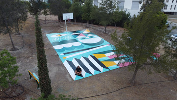 Ένα πρωτοποριακό και πολύχρωμο έργο τέχνης δεσπόζει στο γήπεδο καλαθοσφαίρισης στην Οδό Φιλίας στην Αγλαντζιά, έργο του απόφοιτου του Ευρωπαϊκού Πανεπιστημίου Κύπρου, graphic/visual designer, Στέλιου Παπαγεωργίου.
