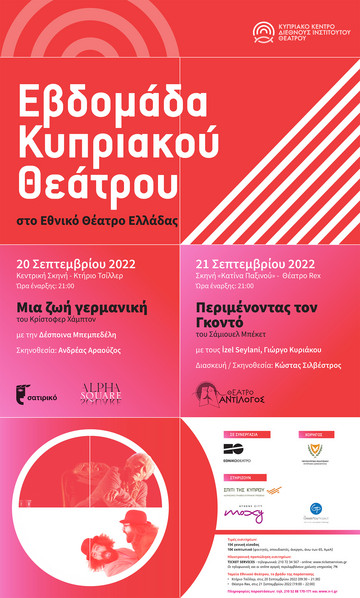 Το Κυπριακό Κέντρο Διεθνούς Ινστιτούτου Θεάτρου σε συνεργασία με το Εθνικό Θέατρο Ελλάδας παρουσιάζουν την πρώτη «Εβδομάδα Κυπριακού Θεάτρου», που θα φιλοξενηθεί στις σκηνές του Εθνικού Θεάτρου στην Αθήνα, στις 20 και 21 Σεπτεμβρίου 2022.