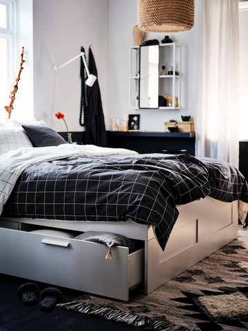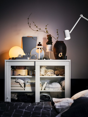 Βοηθητικά αξιοποιείται και ένα ντουλάπι με ή χωρίς γυάλινες πόρτες, όπου μπορούν να τοποθετούν πράγματα στα οποία θέλουν να έχουν εύκολη πρόσβαση. Ένα σημαντικό κεφάλαιο στο υπνοδωμάτιο είναι και ο φωτισμός, αφού ανάλογα με τη χρήση πρέπει να είναι πότε λιγότερος πότε περισσότερος. Ο συνδυασμός μίας ράγας φωτισμού οροφής με ένα επιτραπέζιο φωτιστικό εξασφαλίζει την ιδανική ατμόσφαιρα και εξυπηρετεί ανά περίπτωση τις διαφορετικές ανάγκες του ίδιου χώρου. Τέλος, ένα χαλί όπως το TANNISBY, με ασπρόμαυρο και γκρι μοτίβο, ολοκληρώνει το αποτέλεσμα όχι μόνο πρακτικά αλλά και αισθητικά.