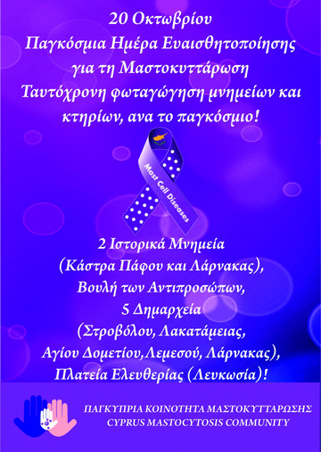 Στη Κύπρο μετά απο πρωτοβουλία της Παγκύπριας Κοινότητας Μαστοκυττάρωσης, 2 Ιστορικά Μνημεία (Μεσαιωνικά κάστρα Πάφου και Λάρνακας), 5 Δημοτικά Μέγαρα (Στροβόλου, Λακατάμειας, Αγίου Δομετίου, Λεμεσού και Λάρνακας) και η Πλατεία Ελευθερίας στη Λευκωσία, φωταγωγήθηκαν την εν λόγω ημέρα με χρώμα μώβ για να σταλεί, παγκόσμια, το μήνυμα της Ευαισθητοποίησης για την εν λογω πάθηση.