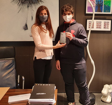 Σε μία σεμνή τελετή, τηρώντας με ευλάβεια τα μέτρα προστασίας, η κυρία Χριστιάννα Διογένους, CEO της Unicars παρέδωσε στα δύο παιδιά τα δώρα τους, ενώ είχε την ευκαιρία να συζητήσει μαζί τους αλλά και με τις οικογένειες τους για τις στιγμές έμπνευσης που τα οδήγησαν στην δημιουργία των βραβευμένων έργων τους, αλλά και λεπτομέρειες για τα νέα τους έργα! Παρόντες στην παράδοση των δώρων ήταν από τον σύνδεσμο ο Γιώργος Πενηνταέξ και η Μάρω Χατζηχριστοφή.