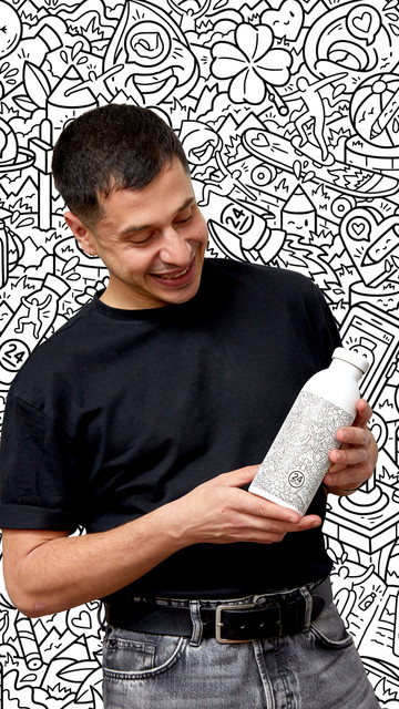 O Francesco Caporale με την βοήθεια του Doodle Art ζωγράφισε την εξέλιξη του brand της 24Bottles στους τοίχους του Flagship Store τους στο Μιλάνο για να αποτυπώσει την μοναδική του ιστορία. Η 24Bottles επίλεξε αυτό τον τρόπο για να δώσει μια μοντέρνα αίσθηση στο brand μακριά από τα αυστηρά μοτίβα και παράλληλα να προωθήσει ένα ελεύθερο τρόπο σκέψης. Η σειρά FRA διατίθεται σε δύο εκδοχές, FRA με πορτοκαλί και FRA με λευκό φόντο, ενώ διαθέτει μια μοναδική επίστρωση στο εξωτερικό της, που την προστατεύει από γρατζουνιές δίνοντας της παράλληλα μια αίσθηση πολυτέλειας.