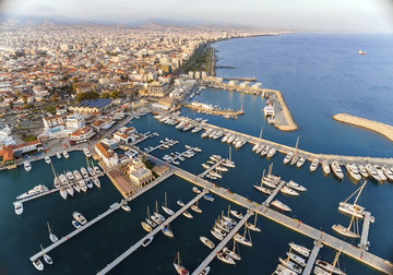 Aerial view of the beautiful Marina in Limassol city in Cyprus, the beach, boats, piers, villas, commercial area, old port (palio limani) and Molos. A very modern, high end and newly developed space where yachts are moored and it’s perfect for a waterfront promenade.