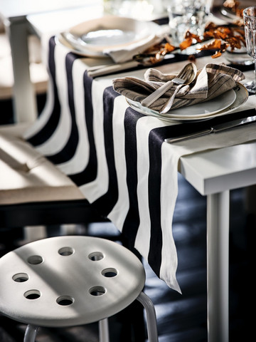 Στο επίκεντρο, δύο τραπέζια MELLTORP σε λευκό χρώμα παρέχουν την απαραίτητη επιφάνεια, ενώ μαζί με τις μαύρες καρέκλες STEFAN ολοκληρώνεται ένας άρτιος συνδυασμός τόσο πρακτικά όσο και αισθητικά. Για έναν σωστό φωτισμό, που θα δημιουργεί όμως και μία ατμόσφαιρα ζεστασιάς, δύο φωτιστικά οροφής SKURUP τοποθετημένα στο κατάλληλο ύψος τοποθετούνται πάνω από την ολοκληρωμένη πλέον τραπεζαρία. Την επιφάνεια του τραπεζιού ντύνει ύφασμα με το μέτρο SOFIA σε έναν ριγέ συνδυασμό, επίσης ασπρόμαυρο. Tο σερβίτσιο, το οποίο μπορεί να αξιοποιηθεί σε ποικίλες περιστάσεις, γιορτινές και καθημερινές, περιλαμβάνει επιλογές όπως πιάτα φρούτου OFSTAT, μαχαιροπίρουνα UPPHOJD και ποτήρια κρασιού POKAL σε ουδέτερο χρώμα ή διάφανα.