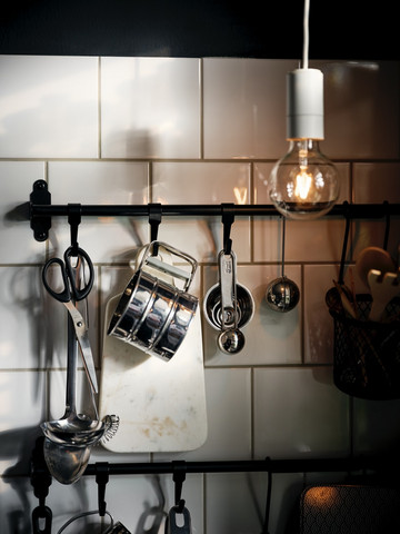 Όσον αφορά τον πάγκο της κουζίνας, εκεί όπου το μαγείρεμα επιβάλλεται να είναι μία ευχάριστη και δημιουργική διαδικασία, μία ράγα HULTARP είναι το αξεσουάρ που λύνει τα χέρια της επίδοξης ή του επίδοξου σεφ, αφού από αυτήν κρέμονται δοχεία HULTARP για τοποθέτηση μαχαιροπίρουνων που θα είναι προσβάσιμα ανά πάσα στιγμή. Σε κοντινή απόσταση, φυσικά, βρίσκονται όλα αυτά τα μικρά που αποδεικνύονται κάθε τόσο εξαιρετικά χρήσιμα. Μία πετσέτα κουζίνας RINNIG για στεγνά χέρια είναι ίσως πρώτη πρώτη στη λίστα. Παράλληλα, οι διαδικασίες του μαγειρέματος γίνονται εύκολα αλλά και σωστά. Έτσι, η επιφάνεια κοπής PROPPMATT προστατεύει, όσο εμείς κόβουμε τα υλικά μας, τις υπόλοιπες επιφάνειες. Ακόμα, μία βάση μαχαιριών JAMFORA αποδεικνύεται ιδανική για την ασφαλή τοποθέτηση των αιχμηρών αντικειμένων, ενώ σε κοντινό σημείο τοποθετείται και η βάση HEAT για κατσαρόλα, ώστε την κατάλληλη ώρα να χρησιμοποιηθεί για το ζεστό φαγητό που θα πρέπει να απομακρυνθεί από τη φωτιά και θα είναι έτοιμο να σερβιριστεί.