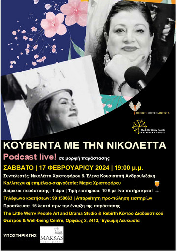 Σάββατο 17 Φεβρουαρίου 2024, 1900 μ.μ., The Little Worry People Art and Drama Studio and Rebirth Κέντρο Διαδραστικού Θεάτρου & Well-being Centre, Ορφέως 2, 2413 Μακεδονίτισσα, Λευκωσία. Υπεύθυνο παραγωγής Αντρέι Κρουπά. Διάρκεια παράστασης: 1 ώρα, Τηλέφωνο κρατήσεων: 99 358663, Τιμή εισιτηρίου: 10 ευρώ με ένα ποτήρι κρασί, Απαραίτητη προ-πώληση εισιτηρίων, tickets are not refundable