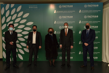 από αριστερά προς δεξιά: ο Εκτελεστικός Διευθυντής του Συνδέσμου κ Νικόλας Φιλίππου, Αρχιτέκτονες Μηχανικοί Ιωακείμ – Λοϊζάς κ. Κατερίνα Λοϊζά, Γραμματέας Υπουργικού Συμβουλίου κ Θεoδόσης Α. Τσιόλας και η Πρόεδρος του ΠΑΣΥΚΑΦ Δρ. Άννα Αχιλλεούδη