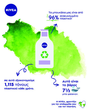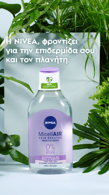 Τα μπουκάλια της δημοφιλούς οικογένειας προϊόντων NIVEA MicellAIR® κατασκευάζονται πλέον από 96% ανακυκλωμένο πλαστικό. Οι συνθέσεις μας αφαιρούν αποτελεσματικά το μακιγιάζ και τους ρύπους χωρίς υπολείμματα, ενώ είναι και vegan.