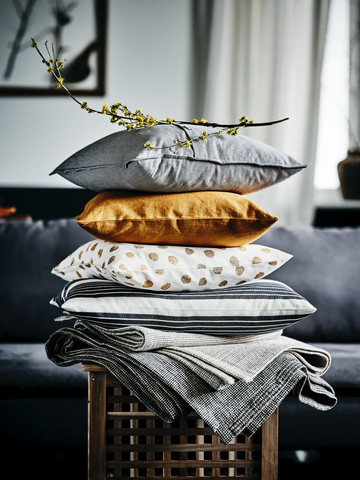 Το γραφείο μπήκε σε τάξη και ήρθε η ώρα να φτιαχτεί και ο χώρος που χαλαρώνει η οικογένεια, μόνη ή με παρέα. Τα συστήματα καθισμάτων ή οποιοσδήποτε άλλος πολυμορφικός καναπές μπορούν να χρησιμοποιηθούν ανεξάρτητα ή να συνδυαστούν δημιουργώντας τη σύνθεση που ταιριάζει στις ανάγκες της οικογένειας. Είναι σημαντικό ότι αυτός ο καναπές επέτρεψε να υπάρχει στον χώρο άνεση, αφού μετακινώντας κάποια από τα καθίσματα ο χώρος μπορεί και ανοίγει, εξασφαλίζοντας έτσι τη δυνατότητα στον καθένα να έχει τη δική του γωνιά ή, όταν έρχονται φίλοι, να χωράνε όλοι με μεγαλύτερη ευκολία. Συνδυαστικά, η ανάγκη για επιπλέον καθίσματα καλύπτεται με τα πουφ SANDARED ή άλλα πουφ και υποπόδια. Όσο για την ολοκλήρωση του καθιστικού, μία πρακτική λύση είναι τα τραπεζάκια ζιγκόν, όπως το LACK, εξαιρετικά εύκολα στη μετακίνησή τους, καθώς και κάποιο από τα βοηθητικά τραπεζάκια που περιμένουν διακριτικά τη στιγμή που θα είναι απαραίτητα και θα κληθούν να μας εξυπηρετήσουν. Φυσικά, η ατμόσφαιρα ολοκληρώνεται με το σωστό χαλί που ζεσταίνει απευθείας τον χώρο. Η επιλογή του χαλιού είναι καθαρά προσωπική υπόθεση και εδώ η οικογένειά μας επέλεξε το TIPHEDE, χαλί χαμηλής πλέξης από βαμβάκι, ένα απαλό, φυσικό υλικό που απαιτεί ελάχιστη φροντίδα. Το σπίτι έχει σαν βάση το ασπρόμαυρο χρώμα και η οικογένεια ήθελε να φωτίσει το καθιστικό με μαξιλαράκια και ριχτάρια και να του προσθέσει ενδιαφέρον με διακοσμητικά αλλά και πόστερ που σπάζουν τη λευκή μονοτονία του τοίχου. Με διάφορα καλύμματα μαξιλαριών και ένα ριχτάρι EVALI ενισχύουν την όμορφη ατμόσφαιρα και δημιουργούν μια πιο έντονη αίσθηση ζεστασιάς. Ο τοίχος στολίζεται, χωρίς να ξεφύγει όμως από τη λογική του άσπρου – μαύρου, με πόστερ που χαρίζουν ζωντάνια στον χώρο.