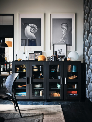 Αυτό που κάνει το κάθε σπίτι να γίνεται “σπίτι μας” είναι τα προσωπικά μας αντικείμενα, αυτά που μαζέψαμε μέσα στα χρόνια και ως άτομα αλλά και ως οικογένεια σίγουρα θέλουμε χώρους για να τα βάλουμε με τέτοιο τρόπο, ώστε να μπορούμε να τα βλέπουμε και να θυμόμαστε όμορφες στιγμές. Το ντουλάπι BRIMNES, με πόρτες που έχουν γυαλί, προστατεύει τα αναμνηστικά μας και παράλληλα μας επιτρέπει να τα βλέπουμε όποτε θέλουμε. Ο φωτισμός ολοκληρώνει το αποτέλεσμα και βοηθάει στο να δημιουργούμε ατμόσφαιρα ανάλογα με τη στιγμή αλλά και τη χρήση του καθιστικού. Ένα φωτιστικό δαπέδου SKURUP ενισχύει τον φωτισμό οροφής και μας επιτρέπει να κατευθύνουμε το φως εκεί που θέλουμε, καθιστώντας το ιδανικό για διάβασμα αλλά και για να φωτίζουμε μόνο συγκεκριμένα σημεία.