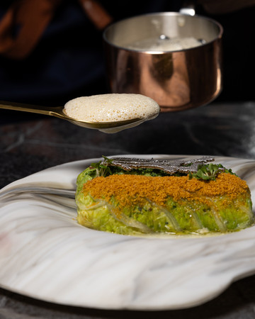 Ανεβαίνοντας στον πάνω όροφο, η εμπειρία των επισκεπτών γίνεται πιο… εστιατορική. Το αριστοτεχνικά σχεδιασμένο μενού επιτρέπει στους πελάτες να προσαρμόσουν το γευστικό τους ταξίδι και να ζήσουν την απόλυτη γαστρονομική εμπειρία. Highlight του χώρου: τα τραπέζια που περιβάλλουν το μεγάλο μπαρ, τα οποία προσφέρουν μια μαγευτική θέα στη θάλασσα.