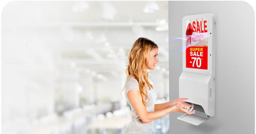 Στο επάνω μέρος του Digital Signage υπάρχει μια φωτεινή οθόνη που επιτρέπει στον αγοραστή του προϊόντος να παρουσιάσει ένα μήνυμα στον περαστικό που θα χρησιμοποιήσει το αντισηπτικό.