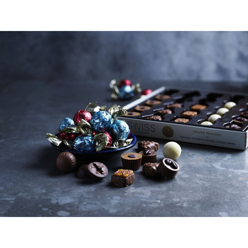 Μια αποκλειστική συλλογή από ελβετικές τρούφες και σοκολατάκια με μαύρη, λευκή και σοκολάτα γάλακτος.