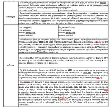 [3] Εκτιμάται σε σχέση με το προφίλ χρήσης ενός μέσου/τυπικού χρήστη. Αξιολογήθηκε ανεξάρτητα από το Strategy Analytics μεταξύ 2021.12.08–12.20 στις ΗΠΑ και το Ηνωμένο Βασίλειο με προεκδόσεις των μοντέλων SM-S901, SM-S906, SM-S908 υπό προεπιλεγμένη ρύθμιση χρησιμοποιώντας δίκτυα 5G Sub6 (δεν δοκιμάστηκε σε δίκτυο 5G mmWave). Η πραγματική διάρκεια ζωής της μπαταρίας ποικίλλει ανάλογα με το περιβάλλον δικτύου, τις λειτουργίες και τις εφαρμογές που χρησιμοποιούνται, τη συχνότητα κλήσεων και μηνυμάτων, τον αριθμό των φορών φόρτισης και πολλούς άλλους παράγοντες.