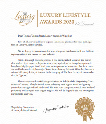 “Η άψογη απόδοση και οι φιλοδοξίες σας να είστε πάντα κορυφαίοι έχουν εκτιμηθεί ιδιαίτερα. Και τώρα είμαστε στην ευχάριστη θέση να ανακοινώσουμε ότι, σύμφωνα με τα αποτελέσματα της μελέτης μας, το “Οίνου Στράτα” είναι ο νικητής ανάμεσα στα πιο πολυτελή καταλύματα της Κύπρου”