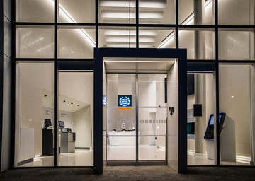 Συγκεκριμένα στην είσοδο του καταστήματος υπάρχει χώρος υποδοχής με ελεγχόμενη πρόσβαση, ο οποίος λειτουργεί ολόκληρο το24ωρο για αδιάλειπτη και διακριτική εξυπηρέτηση των επιχειρηματικών και όχι μόνο, πελατών της Τράπεζας. Στο χώρο υπάρχουν τρεις μηχανές για συναλλαγές που διενεργούν επιχειρήσεις και τέσσερις μηχανές που εξυπηρετούν τις ανάγκες ιδιωτών.
