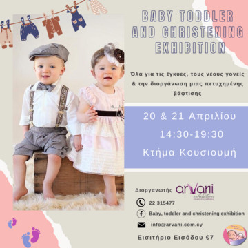 • Baby Toddler and Christening Expo cy Πάρτε ιδέες για την οργάνωση μιας ονειρεμένης βάφτισης ή ιδέες για την γέννηση και του μωρού σας, με προϊόντα και υπηρεσίες που αφορούν τις εγκύους και τα παιδάκια μέχρι προσχολική ηλικία.