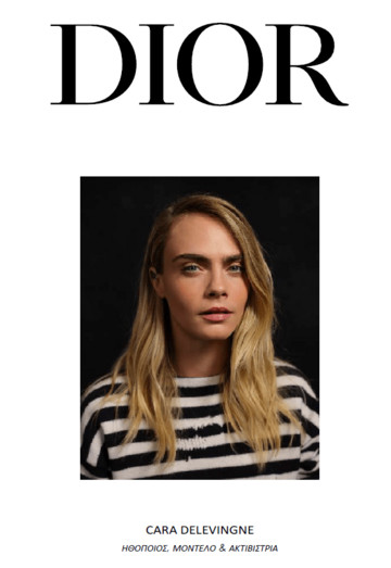 Μια φυσική εκπρόσωπος της γενιάς της με πάνω από 50 εκατομμύρια ακόλουθους στα μέσα κοινωνικής δικτύωσης, η Cara Delevingne είναι μια από τις επιδραστικότερες, νεαρές γυναίκες στον πλανήτη. Ένα έμβλημα της μόδας, που γρήγορα εξελίχθηκε σε αστέρι της πασαρέλας και πρόσωπο διεθνών μαρκών, όπως του Dior σήμερα, είναι επίσης διάσημη ηθοποιός και ακτιβίστρια. Αντιμετωπίζει τις προκλήσεις με απόλυτη επιτυχία χάρη στο θρυλικό, αποφασιστικό χαρακτήρα της, που είναι πάντοτε εντελώς απελευθερωμένος, τολμηρός και αυθόρμητος.