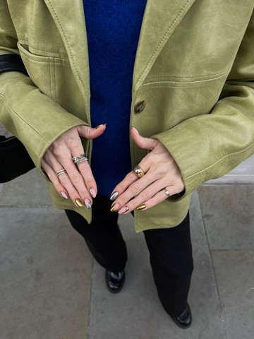 4. Metallic και Glitter Accent: Metallic αποχρώσεις όπως χρυσό, ασημί, μπρονζέ σε ένα ή δύο νύχια ως accent. Ενώ τα Ματ & γυαλιστερά συνδυαστικά για αντίθεση και μοντέρνα αισθητική. Αυτή η τάση είναι ιδανική για όσες θέλουν να προσθέσουν λίγη λάμψη χωρίς να γίνουν υπερβολικές.