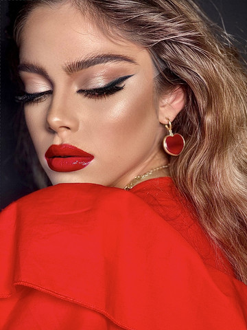 Κι επειδή Valentines beauty look χωρίς κόκκινα χείλη δεν γίνεται μας “Για να πετύχουμε το τέλειο Valentine’s look για τα χείλη χρησιμοποίησα το μολύβι 72 για το περίγραμμα, στην συνέχεια εφάρμοσα το ένα ματ κόκκινο κραγιόν, το νούμερο 12 και από πάνω το αγαπημένο μου red of desire 05 lipgloss.