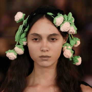 Bora Aksu: Λουλούδια και πάλι αλλά πλεχτά και στερεωμένα στα ελεύθερα μαλλιά. Ρομαντικό μεν αλλά στην πιο εξεζητημένη εκδοχή του. Το βλέμμα είναι τονισμένο με καφέ σκιά που απλώνεται σε όλο το κινητό βλέφαρο με όλο το υπόλοιπο πρόσωπο να παραμένει σχεδόν άτονο.