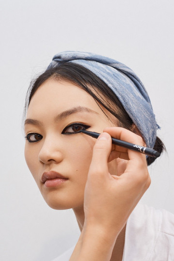 Ο Peter Philips εξηγεί: «Για να τραβήξω την προσοχή προς τα μάτια, χρησιμοποίησα την παλέτα 5 Couleurs Couture 649 Nude Dress για να χρωματίσω διακριτικά το άνω βλέφαρο. Στη συνέχεια, για να δημιουργήσω ένα έντονο γραφιστικό αποτέλεσμα και να δώσω έμφαση, σχημάτισα μια γραμμή eyeliner κατά μήκος της άνω και κάτω γραμμής των βλεφαρίδων με το Diorshow 24h Stylo 091 Matte Black, αλλά χωρίς να εκτείνω τη γραμμή στην εξωτερική γωνία του ματιού. Η γραμμή είναι ισορροπημένη, ούτε λεπτή, ούτε παχιά, αλλά κυριολεκτικά δημιουργεί μια κορνίζα για τα μάτια χαρίζοντάς τους ένταση και «δραματικό» τόνο. Στη συνέχεια, ενίσχυσα το αποτέλεσμα, καλύπτοντας τις βλεφαρίδες με τη μάσκαρα Diorshow Iconic Overcurl 090 Black. Στη συνέχεια περιποιήθηκα τα φρύδια με ένα ελαφρύ άγγιγμα Diorshow Brow Styler και Diorshow Pump ´N’ Brow, ώστε να δείχνουν φυσικά, δομώντας παράλληλα τα μάτια».