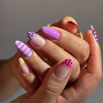Pattern Play: Πουά, ρίγες και διαφορετικές αποχρώσεις. Κάθε νύχι σε αυτό το παιχνιδιάρικο ανοιξιάτικο μανικιούρ έχει ένα εντελώς μοναδικό σχέδιο, αλλά το μυστικό για να μη δείχνει υπερβολικά χαοτικό είναι να επιλέξεις προσεκτικά την παλέτα χρωμάτων.
