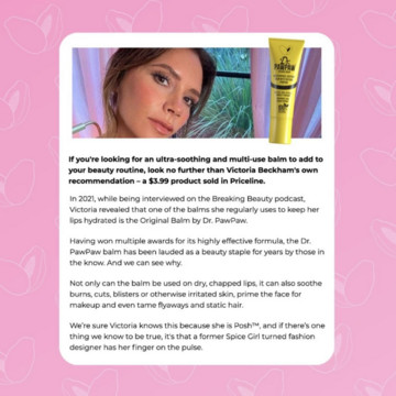 Συγκεκριμένα, πρόκειται για το Dr. Paw Paw Balm που στην κυπριακή αγορά, το βρίσκουμε κάτω από 10 ευρώ. Το balm βοηθάει στην ενυδάτωση και την αναζωογόνηση των ξηρών χειλιών.
