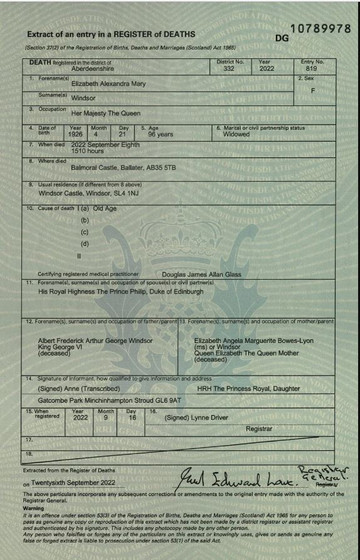 Το πιστοποιητικό θανάτου της βασίλισσας Ελισάβετ αναφέρει τα στοιχεία της, το όνομά της «Elizabeth Alexandra Mary Windsor», τόπο θανάτου το Μπαλμόραλ και την αιτία του θανάτου της: «Old Age», δηλαδή «Γηρατειά».