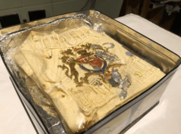 Με λευκό γλάσο και αμυγδαλόπαστα, το κομμάτι που πουλήθηκε ήταν διακοσμημένο με μια ζαχαρένια εκδοχή των βασιλικών οικόσημων, όπου δέσποζαν ένα λιοντάρι και ένα άλογο.