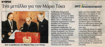 Πάνε 20 χρόνια (8/3/2001), από τότε που ο Μάριος Τόκας βραβεύτηκε από τον τότε πρόεδρο της Κυπριακής Δημοκρατίας, Γλαύκο Κληρίδη, με το “Μετάλλιο Εξαίρετης Προσφοράς” που αποτελεί την ύψιστη τιμή της Κυπριακής Δημοκρατίας.