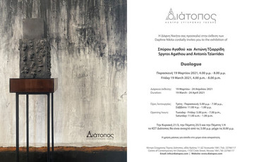Το Κέντρο Σύγχρονης Τέχνης Διάτοπος με ιδιαίτερη χαρά ανακοινώνει την επαναλειτουργία του και παρουσιάζει την έκθεση Duologue, μια εικαστική συνομιλία των Σπύρου Αγαθού και Αντώνη Τζιαρρίδη. Ο χώρος μας ανοίγει την Παρασκευή 19 Μαρτίου 2021 από τις 4 μέχρι και τις 8 μμ.
