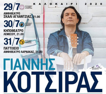 Ο δεύτερος καλλιτέχνης, είναι ένας από τους πιο αγαπημένους της γενιάς μας. Πρόκειται για τον Γιάννη Κότσιρα, ο οποίος έρχεται για τρεις μοναδικές εμφανίσεις σε Λευκωσία στις 29 Ιουλίου, στη Λεμεσό 30 Ιουλίου και στη Λάρνακα στις 31 Ιουλίου.