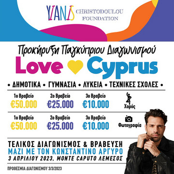 Σε συνέχεια της επιτυχημένης διοργάνωσης τριών Παγκύπριων Διαγωνισμών μέσα από οποίους προωθήθηκε η αναβάθμιση των σχολικών μονάδων και η αγορά εξοπλισμού, το Φιλανθρωπικό Ίδρυμα ‘Yianis Christodoulou Foundation’ προκηρύσσει νέο διαγωνισμό με τίτλο ‘LOVE CYPRUS’ με έπαθλα €170.000 (εκατό εβδομήντα χιλιάδες ευρώ)και καταληκτική ημερομηνία την 3η Μαρτίου 2023. Ο νέος αυτός διαγωνισμός απευθύνεται σε δημόσια σχολεία Δημοτικής, Μέσης Γενικής και Μέσης Τεχνικής Επαγγελματικής Εκπαίδευσης και Κατάρτισης, τα οποία μπορούν να συμμετάσχουν με ατομικές ή ομαδικές δημιουργίες των μαθητών/τριων.