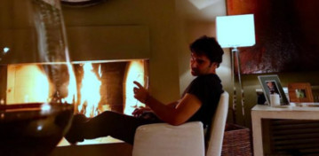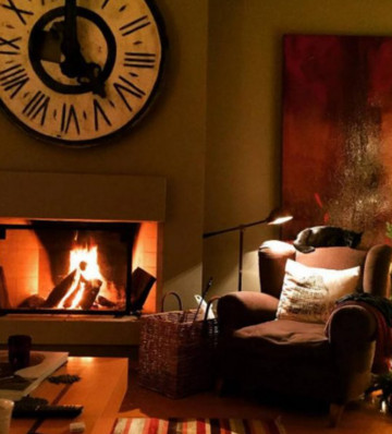 Τα λαμπατέρ σε διάφορες γωνίες και η καφέ μπερζέρα δίπλα στο τζάκι ολοκληρώνουν ένα υπέροχο σκηνικό στο προσωπικό χώρο του σκηνοθέτη και ηθοποιού που μάλλον είναι σπιτόγατος…