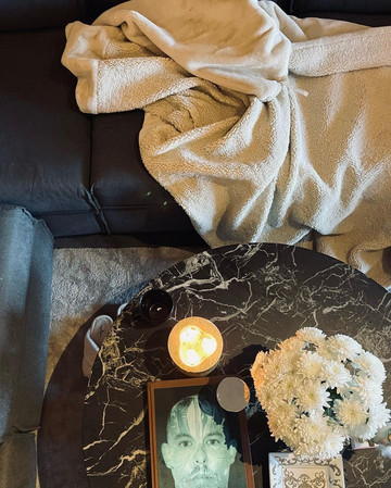 Στο σαλόνι της, κυριαρχούν οι γήινες και γκρι αποχρώσεις με τον μεγάλο, αναπαυτικό γωνιακό καναπέ να ξεχωρίζει. Παράλληλα, το τραπεζάκι σε marble σχέδιο κάνει τη διαφορά ενώ οι επιβλητικοί πίνακες στους τοίχους δίνουν μια άλλη νότα στη διακόσμηση του σαλονιού. Από το σαλόνι φυσικά, δεν λείπουν κεριά αλλά και περιοδικά μόδας σαν μια σωστή fashionista.