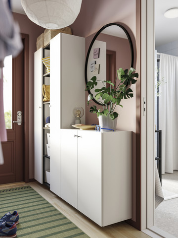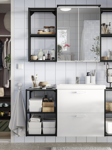 Βήμα 1ο: Πολλαπλασιάζουμε τα διαθέσιμα τετραγωνικά του μπάνιου μας, με το να εκμεταλλευτούμε τους τοίχους. Τα ράφια αποθήκευσης της σειράς ENHET έρχονται σε διάφορα μεγέθη και συνθέσεις, με ντουλάπια ή χωρίς, με λίγα ή περισσότερα ράφια, με χώρο για το πλυντήριο ή το καλάθι για τα άπλυτα, ώστε με μια απλή προσθήκη το μπάνιο σας να αποκτήσει μια λογική στο design του, που θα βοηθήσει στο να είναι τακτοποιημένο και να έχει χώρο για όλα. Εξάλλου, βασική αρχή όταν προσπαθούμε να οργανώσουμε ένα δωμάτιο είναι κάθε πράγμα να έχει τη θέση του.