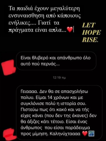 «Είναι θλιβερό και απάνθρωπο όλο αυτό που περνάς. Γειά. Δεν θα σε απασχολήσω πολύ. Είμαι 14 χρονών και με συγκλόνισε πολύ η ιστορία σου. Πιστεύω πως ό,τι κακό και να της είχες κάνει (που δεν της έκανες) δεν θα άξιζες κάτι τέτοιο. Είσαι ένας άνθρωπος που είσαι παράδειγμα προς μίμηση. Καληνύχτα», έγραψε το παιδί στην Ιωάννα.