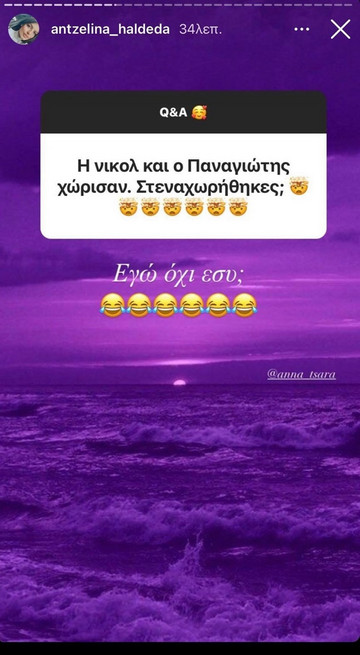 «Η Νικόλ και ο Παναγιώτης χώρισαν. Στεναχωρήθηκες;», ήταν η ερώτηση με την Αντζελίνα να απαντάει: «Εγώ όχι εσύ;».
